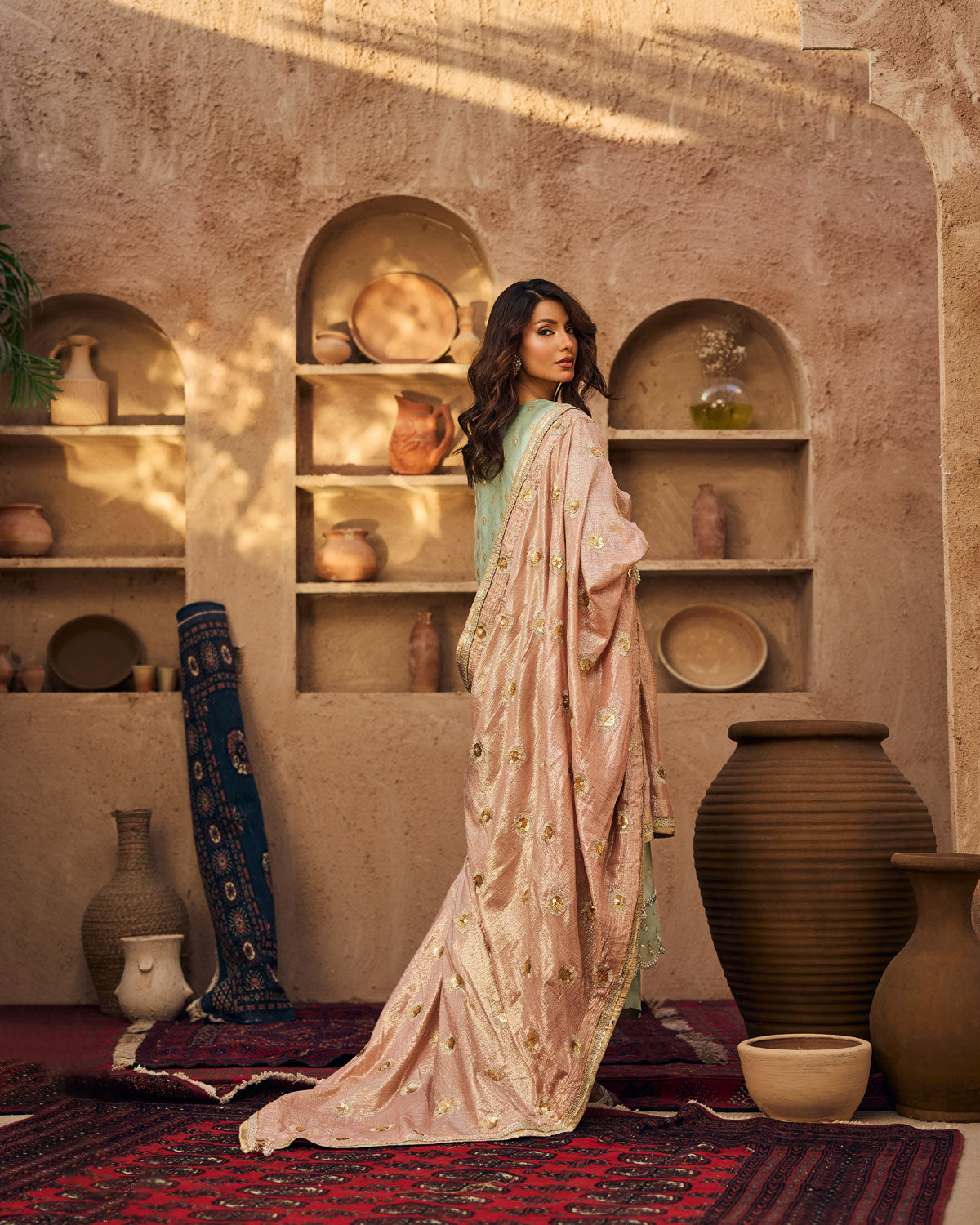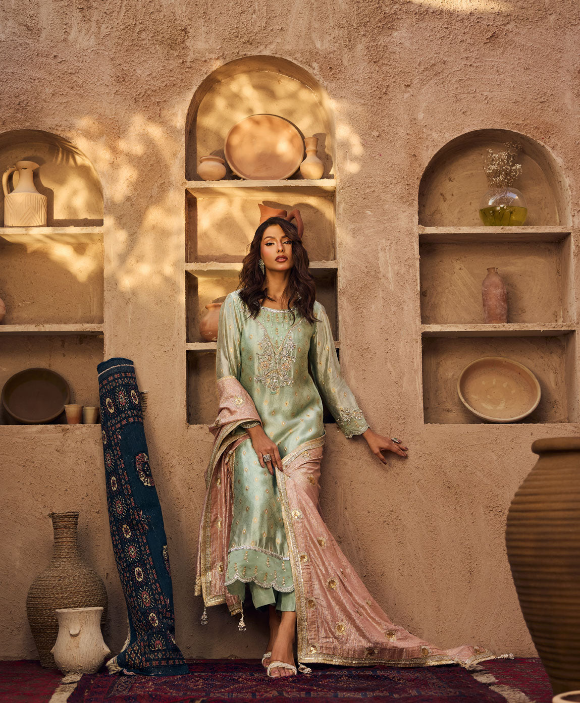 Dupatta: Embroidered shimmer chiffon, finished with laces and banarsi pipin.